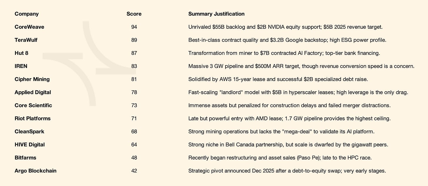 Execution Winner: TeraWulf and Hut 8 have achieved the highest-quality pivots by pairing large-scale power with investment-grade counterparty backstops and non-dilutive financing.